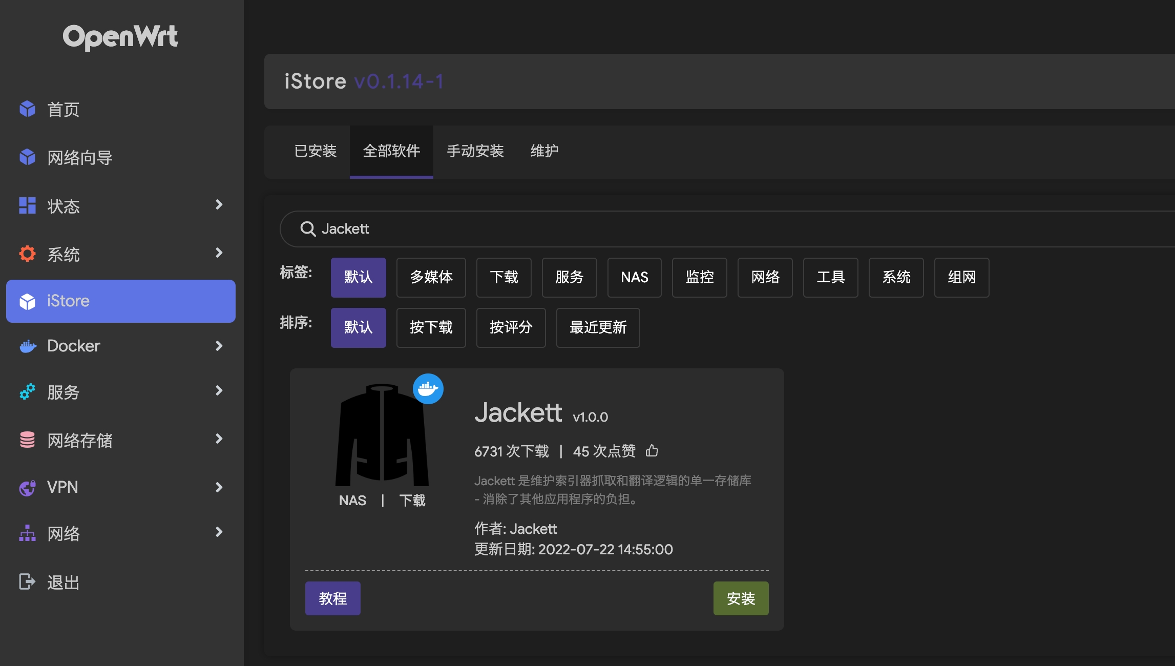 同样的我们在iStore中搜索安装Jackett。
