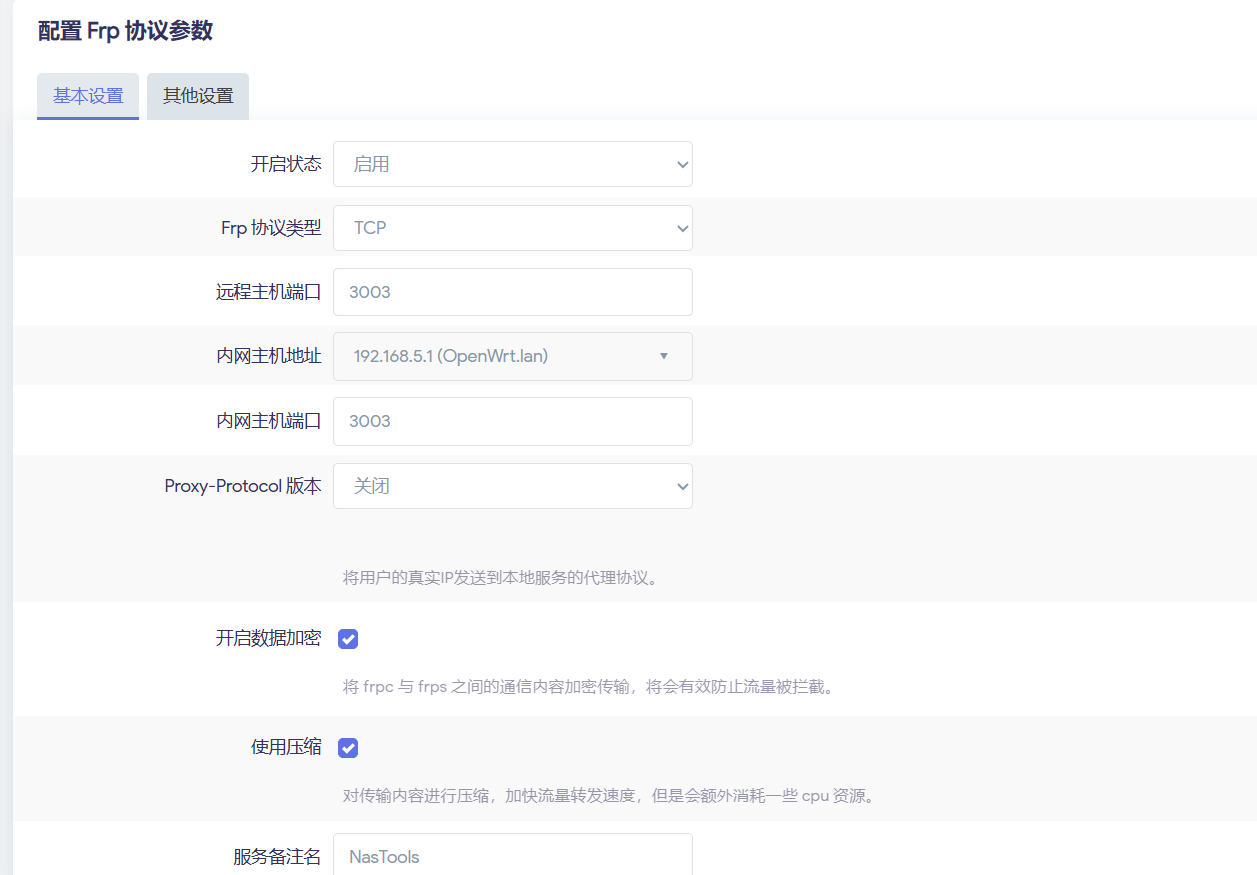 那么,如果需要交互的话,即我在微信端向应用发送消息,这个消息如何转发到NasTools上呢。 这就需要我们用frp进行内网穿透了,将3003端口转发到服务器的指定端口(例如3003)上。