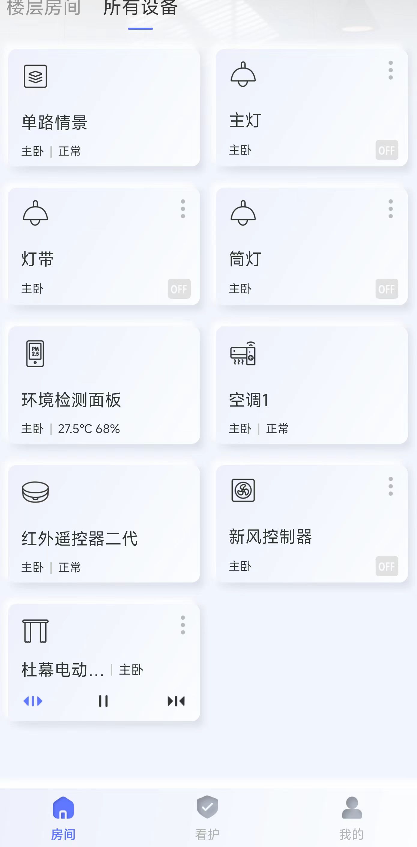 在控客APP左上角切换房间,切换为刚刚绑定的房间,点击所有设备,此时你就可以看到室内大部分的智能设备了。